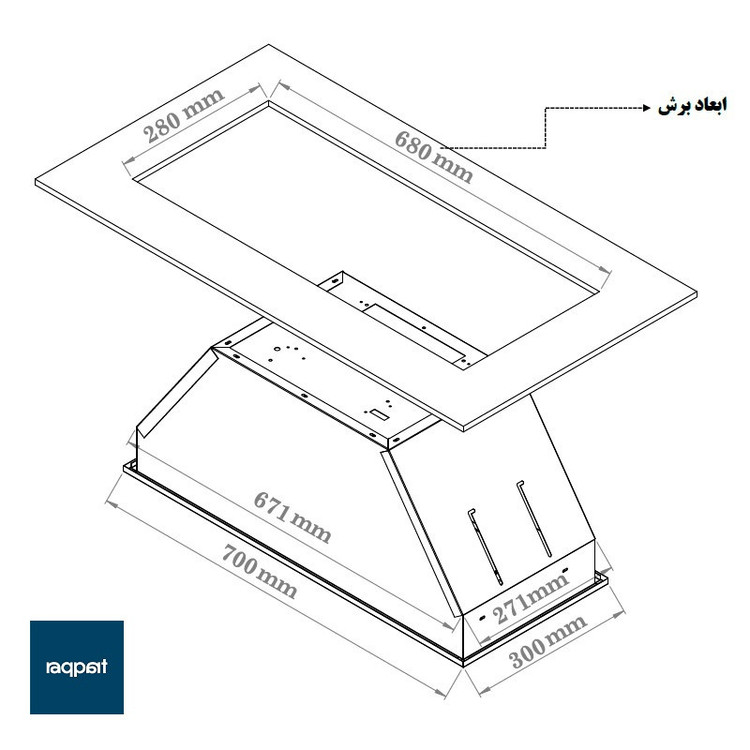 بدنه فولادی مشکی و شیشه سکوریت/کلید لمسی/3عدد لامپ کم مصرف SMD/موتور فلزی مجهز به تایمر/ریموت کنترل/جک گازی /قدرت مکش 700متر مکعب برساعت /ابعاد برش 28x68 سانتیمتر